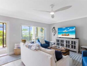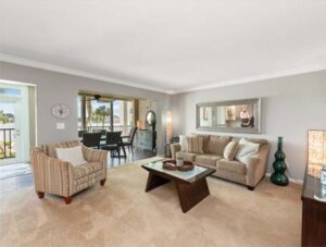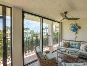 Conveniently located to world-class beaches and Venetian Village shops and fine dining, this beautiful residence features beach, pool and big bay views. Located on the second floor of a low-density building, you can enjoy sunsets from both bedrooms on the private balcony. Extensive updates in all rooms, including all cabinets and countertops in the kitchen and baths. The home was modified to open up the kitchen to the living areas. Both bathrooms have upgraded showers and fixtures. The property recently had impact-glass windows installed to enclose the patio and increase the air-conditioned square footage, currently used as a dining room with stunning views.